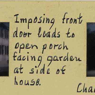 Captioned: "Imposing front door leads to open porch facing garden at side of house."