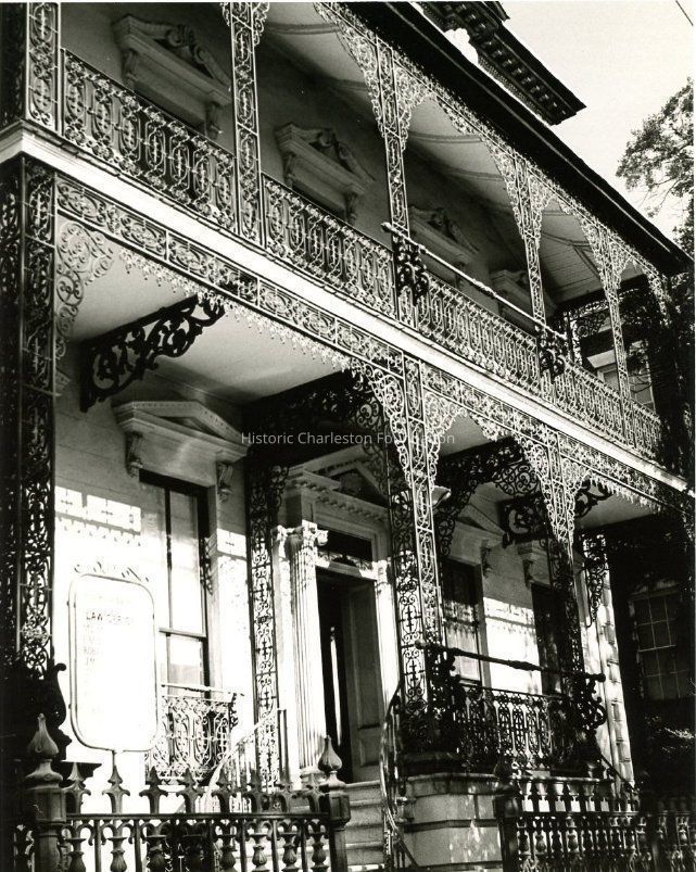 B&W photograph of the front of the John Rutledge House (116 Broad Street), featuring the cast iron balcony and other ironwork.Collection