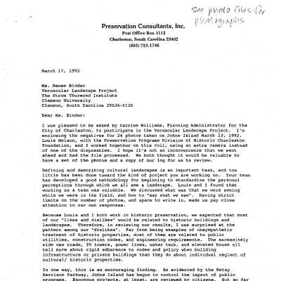 Photographs taken, described, and assessed by Sarah Fick (Preservation Consultants) and Louis Nelson (Historic Charleston Foundation) on March 13, 1992, as part of the Vernacular Landscape Project initiated by the City of Charleston. Fick and Nelson documented their "likes" and/or "dislikes" of each photo and mapped each site. Copy (pdf) of accompanying letter, survey, and map attached to record.Collection