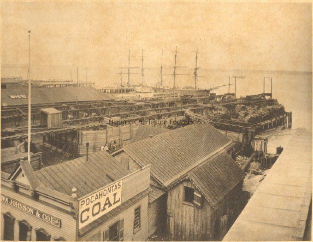 Photograph of the Johnson Wharves, behind the Wm. Johnson & Co./Pocahontas Coal company, located between Vernon and Inspection Streets on Wharf Street (1888 Sanborn Map), or what's today the east end of Laurens Street. Ship masts in the background.Context