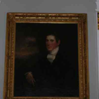 Portrait of Jonathan Lucas III, rice planter, born 1800, died 1848, Charleston, South Carolina. Artist Unknown (Attributed to John Wesly Jarvis (1800-1848), American, first half of 19th cent. Oil on canvas. Half length size, depicting young man seated mid-right area of canvas, with left arm resting on table, having brown wavy hair parted on the right side with whispy curls on high forehead, brown brows, light brown eyes, straight nose, strong chin, rosy cheeks and full lips: subject wearing plain dark coat having rolled collar and covered buttons; sheer jabot, white shirt with collar above stock; dark to light brown, yellow to peach color ground, upper left having landscape with full moon. Canvas is very dark with many repairs.