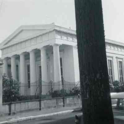 B&W photograph of Kahal Kadosh Beth Elohim Synagogue (90 Hasell Street) (a/k/a KKBE), corner view of the building, west (front) and south elevations. Photo taken from across the street. Tree trunk obscures part of the view.Collection