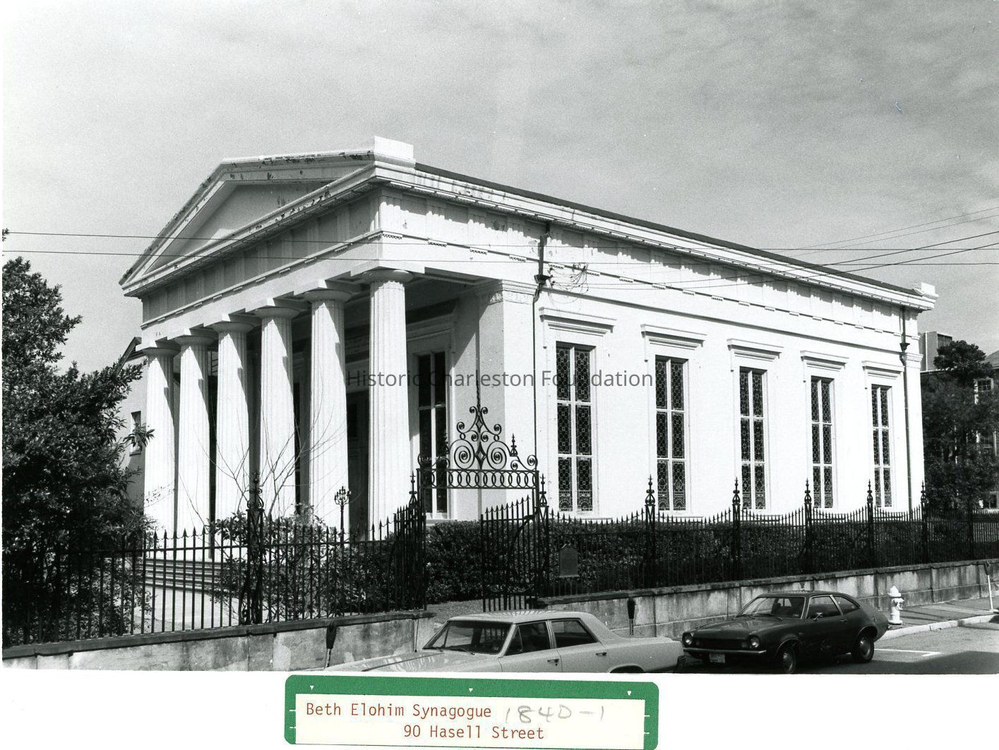 B&W photograph of Kahal Kadosh Beth Elohim Synagogue (90 Hasell Street), corner view of building (southwest elevation).