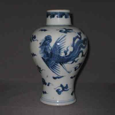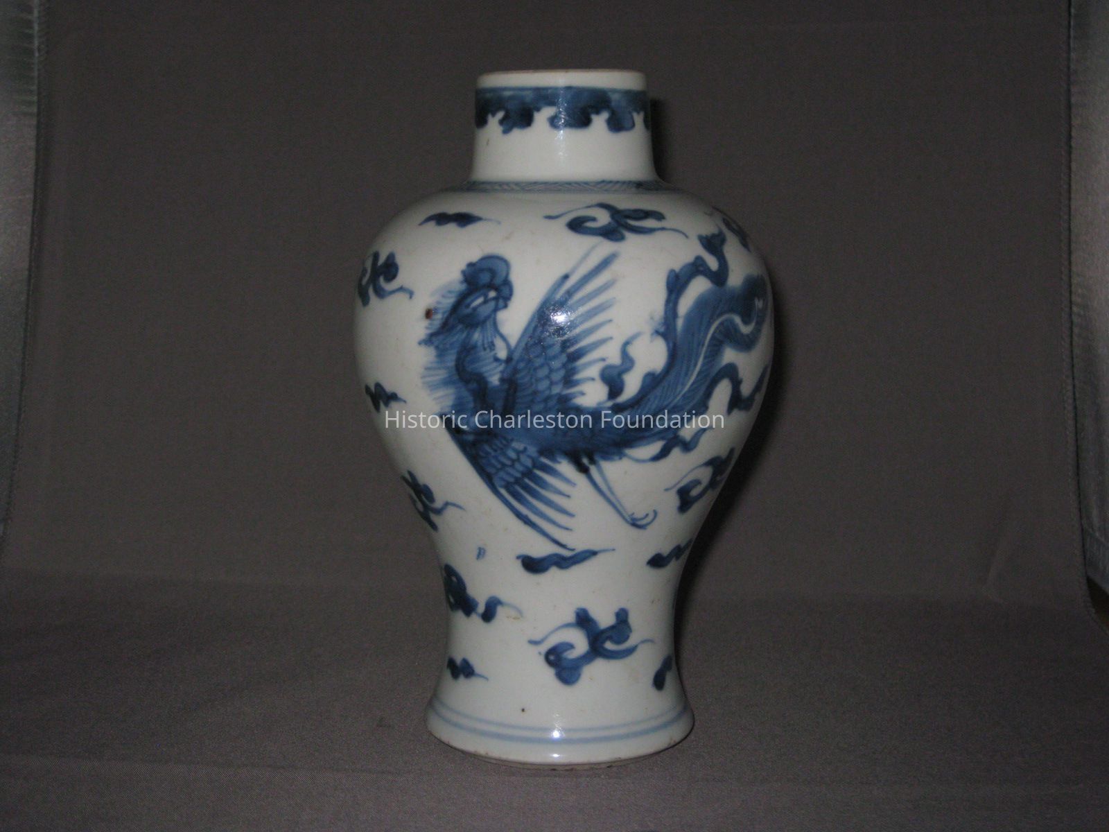 Baluster Vase Decorated in Underglaze Blue with Two Phoenix Birds and Clouds. Raised Cylindrical Neck With. Double Ring Border At Base. H 7 1/8",late 18th-early 19th centuryCollection