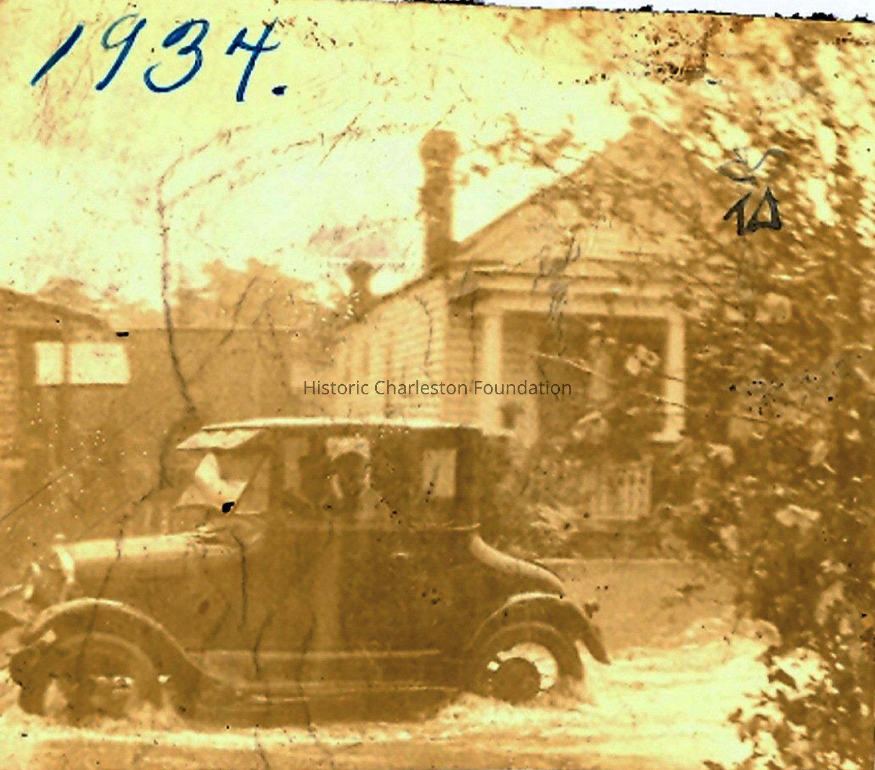 a: Car driving through flood waters in front of 54 Kennedy Street in 1934.