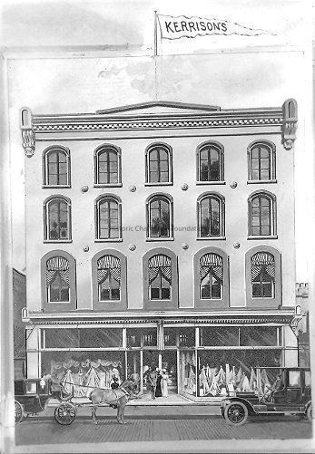 Photographic reprint of a 1920s illustration of the west (front) elevation of Kerrison Dry Goods Building (260 King Street). Kerrison's banner on the rooftop. Car and a horse-drawn carriage are parked in front; two women and a man walk toward the entrance.