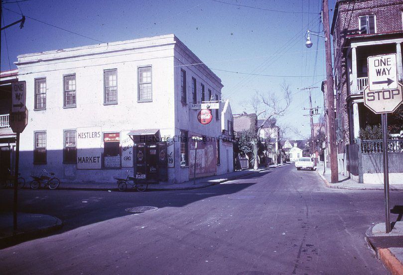 Color Kodachrome slide of 48 Society Street (Susan Robinson Tenements), showing the southeast corner of the building. "Kestler's Market" is painted on the south elevation of the building and signage for Market projects from the east elevation. Also shows the intersection of Anson and Society Streets.
