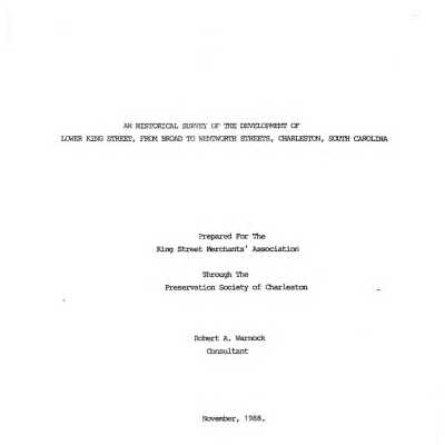 Two file folders that contain newspaper articles (including DYKYC) about issues such as demolition of buildings, revitalization, beautification, Upper King Street, and the "superblock"; miscellaneous images (photocopies); historical research (plats, City Directory pages, maps); report (1988) entitled "An Historical Survey of the Development of Lower King Street From Broad to Wentworth Street" prepared for the Preservation Society for the King Street Merchants' Association by Robert A. Warnock; HCF correspondence from the 1970s relating to beautification; section on the history of King Street from a report by Historic Preservation graduate student; College of Charleston student report "The King Street Riot of 1876"; City of Charleston Design Division Report 04, "New King Street Square" (2014); photograph of 424 King Street (Gene's Electric Service); brief newspaper article about the closing of Morris Sokol Furniture (510 King Street); information about 96 King Street; research report on 609-613 King Street (Lavelle, 2021).Collection