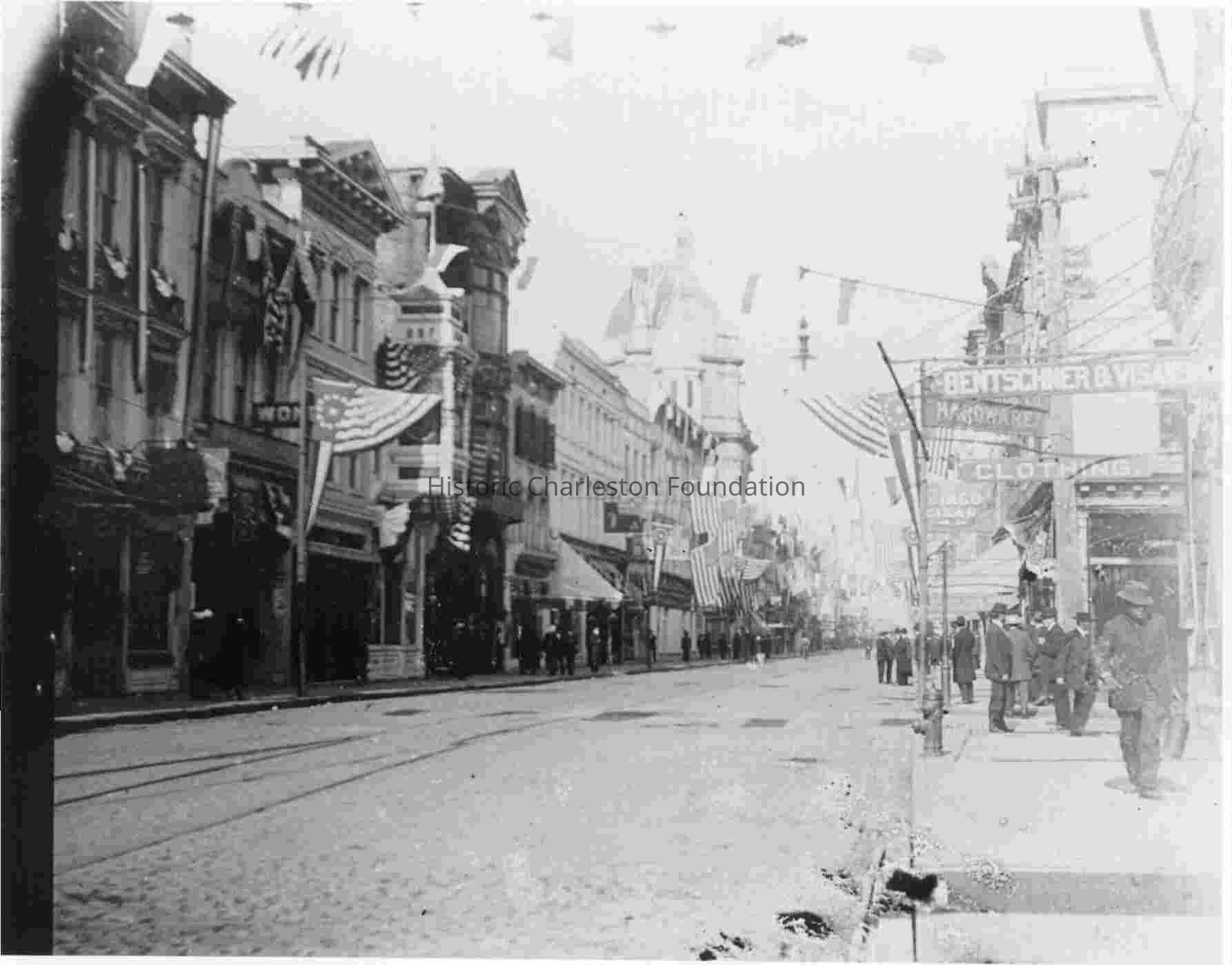 King Street looking north from Beaufain Street, 250 Block. Pedestrians on sidewalk (men). Buildings are decorated for Fleet Week, 11/20/12. Shop signs include Bentschner & Visans__ , Hardware, Clothing, __ngo Cigar Co.Collection