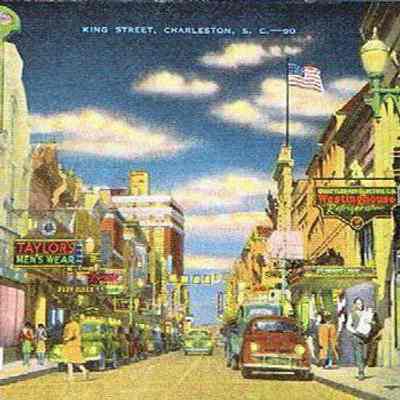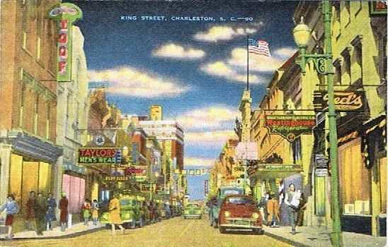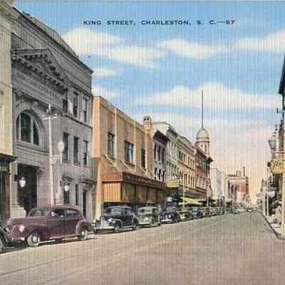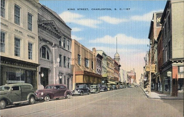 b: Looking north on King Street, 250 block at Hasell Street, ca. 1940s, featuring the west side of the street. Color.