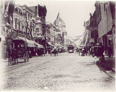 King street scene, 250 Block. Trolley car in background; pedestrians and horse-drawn carriage in foreground. Buildings are decorated with flags for the 1899 Confederate veterans' reunion. Shop signs include C.D. Schirmer, MacBeth's Steam Dyeworks, and Furchgott's.Collection