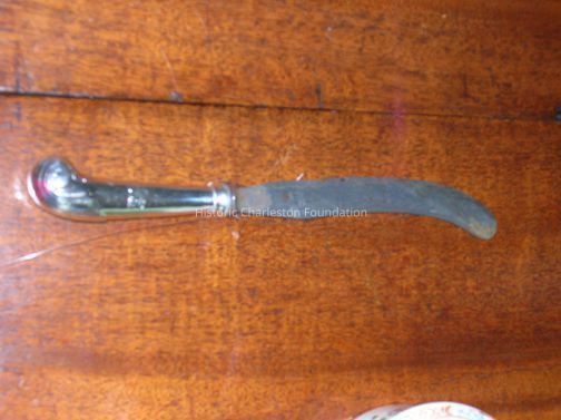 Set of six dinner knives, having leaf capped pistol handle, engraved crest depicting lion with one paw raised, having shaped steel bladesCollection