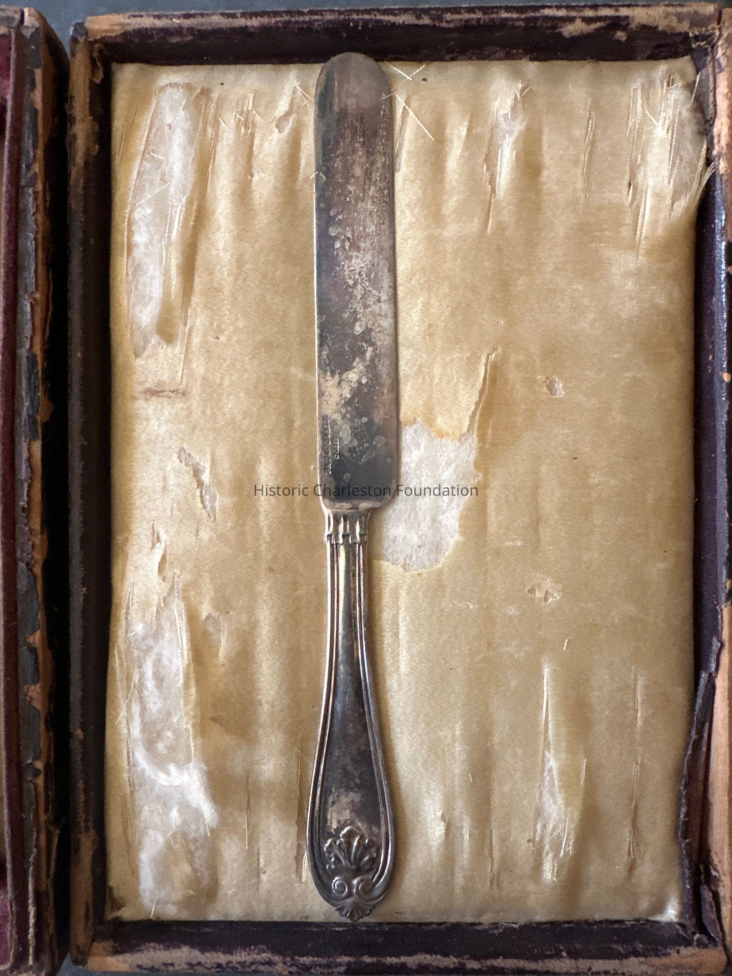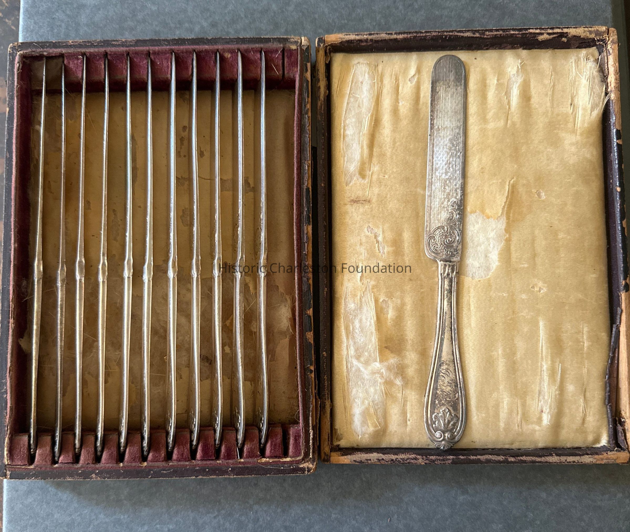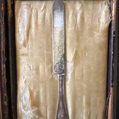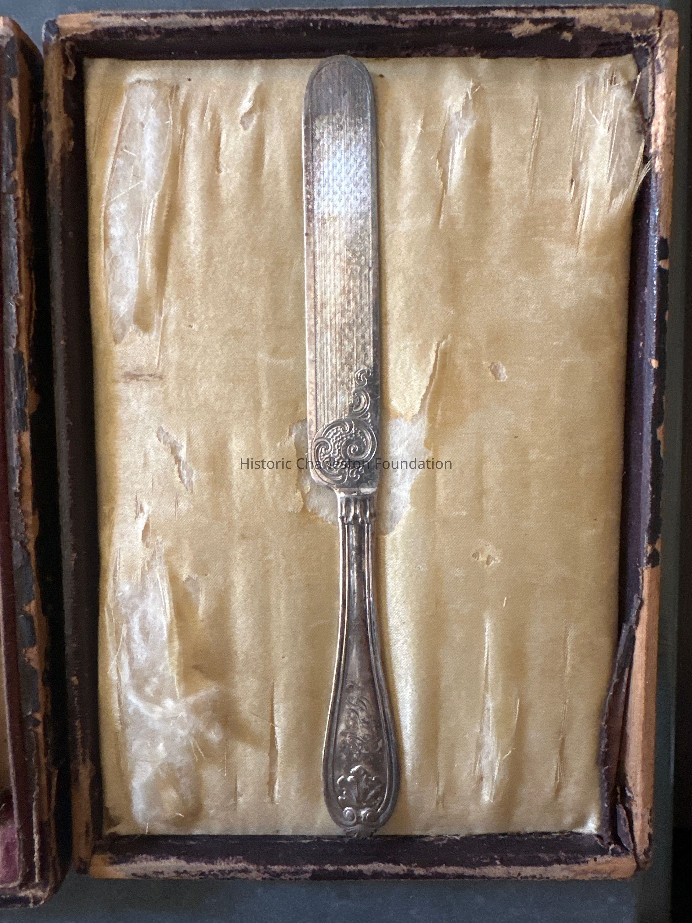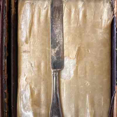 Set of 12 fish knives, each having simple-shaped handle with threaded edge and leaf and scroll terminal, rounded blade having fish scale ground with trip 'C''-scroll decoration at one endCollection