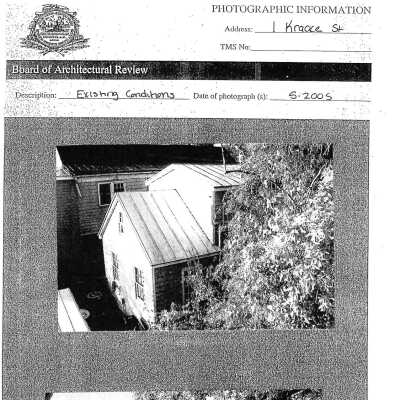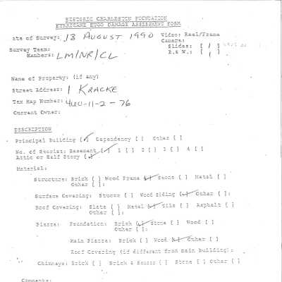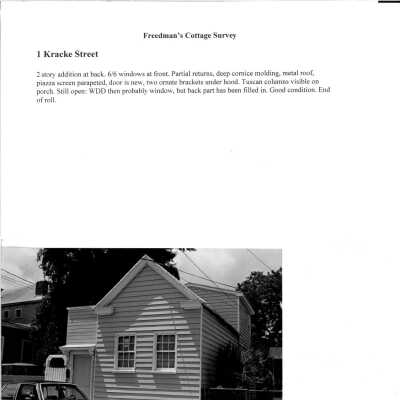 File contains newspaper article about renovations to nine Kracke Street houses (1988); photocopy of documentation (photos and architectural drawings) submitted in support of BAR application for 1 Kracke Street (May 2005) (no indication of approval status); Hurricane Hugo damage survey for 1 Kracke; Freedman's Cottage survey for 1 Kracke.
