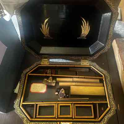 Oblong Box with Clipped Corners, Shaped To and Two Brass Handles. Completely Lacquered with Black Ground and Gilt Decoration of Chinoiserie Figures with Panels. Drawer on Bottom Opens To Reveal Compartments with Center Section with Decorated Lid. Fitted Interior Tray with Compartments and Fitted Boxes.Collection
