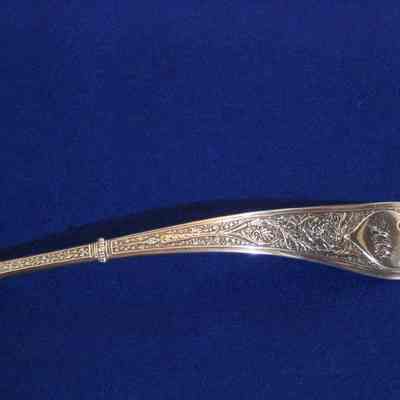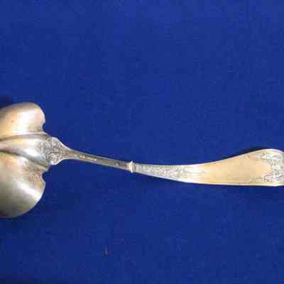 Sterling Silver punch ladle with pointed handle with art Deco floral and heart chaped cartouche engraved with initial 'HAR.'Collection
