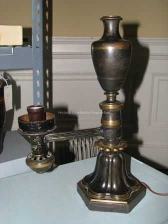 Argand Lamp, lighting fixture on hexagonal brass base with urn style top. The light socket is at the end of a fluted arm that extends from the middle of the lamp. It has been electrified and the burner has been replaced with a light socket. The lamp is painted in a blackish green paint with polished brass accents. Plaque on arm reads: " MESSENGER & SON