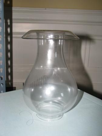The lamp has an urn on top followed by a froup of varying size rings, accated (?) by polished brass and where arm extends from. This rests on a fluted motif which rests on top of a scalloped foot that rest on a hexagonal base.Collection
