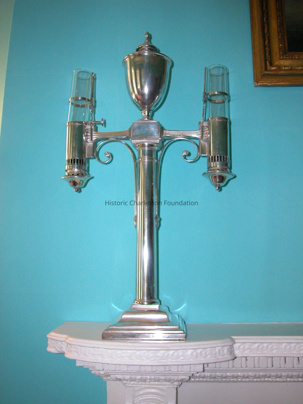 Philadelphian William Bingham, in 1791 ordered some of Argand's lamps, the most approved form of lighting in dining rooms. By the 1830's Thomas Walker in his book The Art of Dining could state positively that lights in dining rooms should be placed on the mantelpiece. George Washington owned several examples of Neo-classical Argand style lamps that survive at Mt. Vernon similar to our recently acquired examples. In Charleston, merchants such as Daniel Caroll on Broad at Union "(State) Street" advertised in 1795 the receipt of a "quantity" of Argand lamps. Similarly, Alexander Ewing on Church Street advertised a quantity of "Patent lamps" in 1797 including "two light pillar lamps" probably like the examples we have just attained. Sarah Russell Dehon's inventory, albeit in the 1850's , speaks of lamps in the dining room probably on the mantelpiece. The pair HCF bought are almost identical to designs by Boulton and to a pair of Argand lamps attributed to Matthew Boulton now at Winterthur.