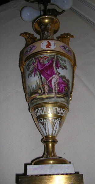Table Lamp, Porcelain, probably Meissen, having vase shaped form, decorated with Grecian landscape and figural scenes, fitted with gilt eagles handles; on faux stone plinth on branze baseCollection