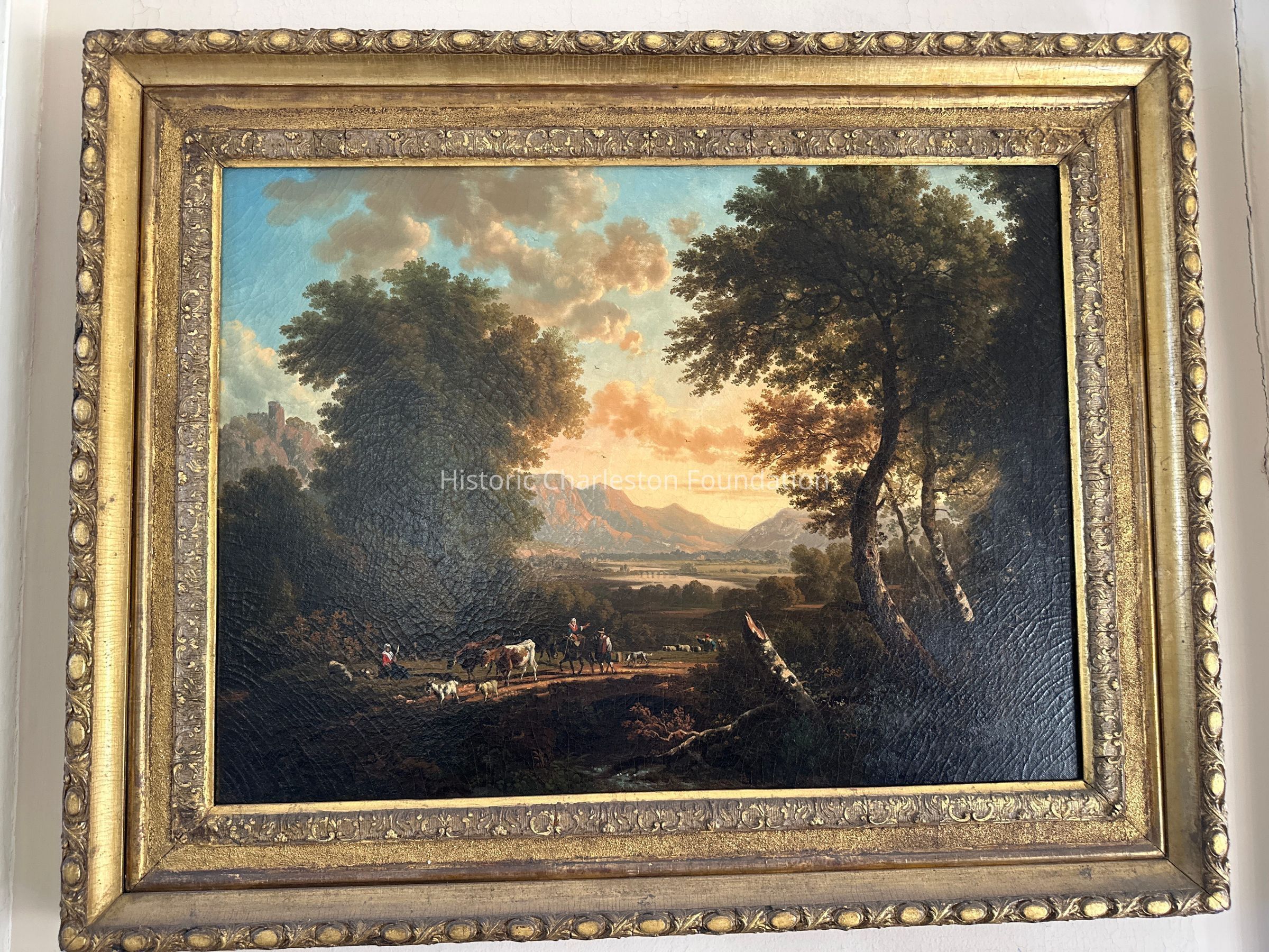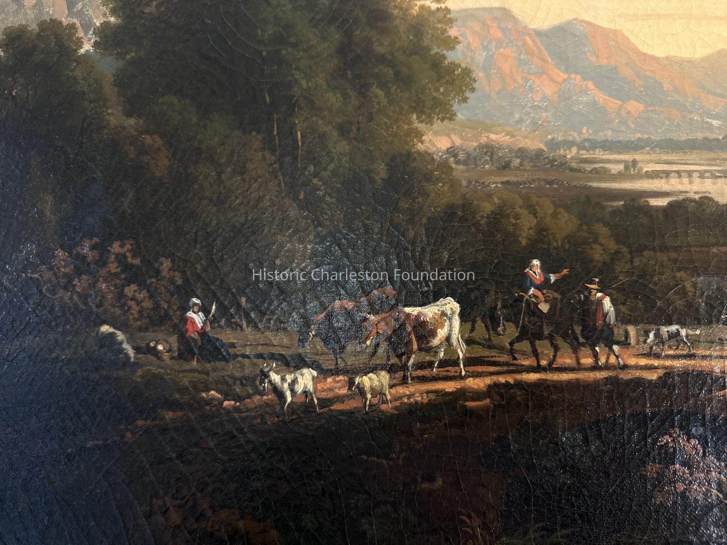 Oil on canvas, no visible signature, depicting landscape scene of woman on donkey with man walking next to her herding goat, sheep, and cattle, shepherd with sheep in pasture, background with river, mountain, trees and blue sky with peach and gray clouds, in period molded gilt gesso frame; inscribed on reverse 'JDA (Joseph D. Aiken), 1854'