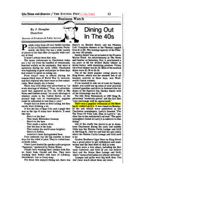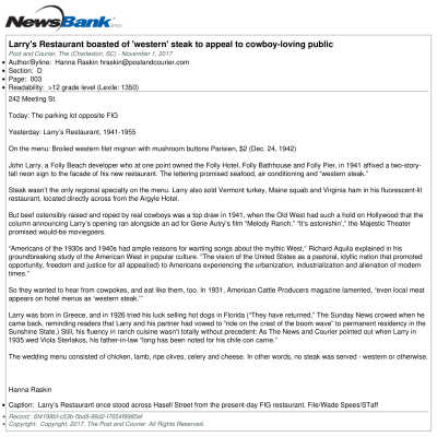 "In this new restaurant we have tried to anticipate your every want" begins the announcement of the opening of Larry's Restaurant in the News & Courier on November 27, 1941. There is no history on the building in HCF's archives, however, in the 1872 Birds-Eye View of Charleston, a building is present at the northeast corner of Meeting and Hasell Streets. By 1884, the two- and three-story buildings that later make up Larry's Restaurant appear on the map as a barber shop and a store, and by 1902 the buildings serve as a restaurant. The restaurant closed in 1955 and in 1980, the building was demolished due to deteriorating conditions. The site now serves as the parking lot for the restaurant across the street, FIG. (Source: Evening Post, News & Courier, and Post & Courier articles accessed via America's News--Historical and Current; Sanborn Maps accessed via Digital Sanborn Maps on Proquest, accessed via Charleston County Public Library website.)Collection
