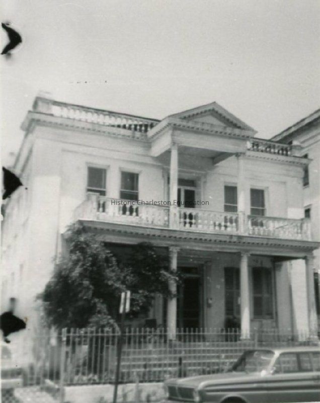 B&W photograph of the Lazarus-Gadsden Building (66 Hasell Street), south (front) elevation, before rehabilitation. Car parked in front of building.