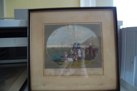 Overall discoloration of print and mat. darkening, yellowing; mat burn, Foxing along lower border of mat and on left middle and lower right side of mat; gilding on frame is chipped; paper backing is very fragile, brittle;