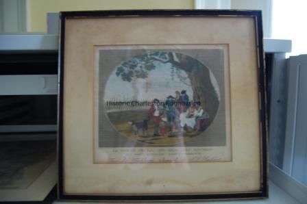 Le Rivage de la Mer....environs Painting by Ja Ph Hacckart (lower left) [possibly Jakob Phillip Hackert (1737-1807) a German painter working in France and Rome] Paper, wood frame ,Group of 4 men, 2 women and 1 child under a tree, having gathered apples, are weighing them and eating them. 2 dogs are also depicted- Background- several sailing ships in harbor.