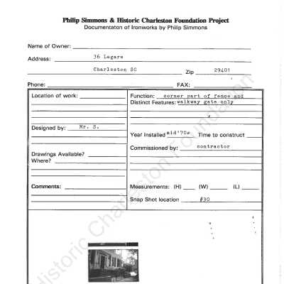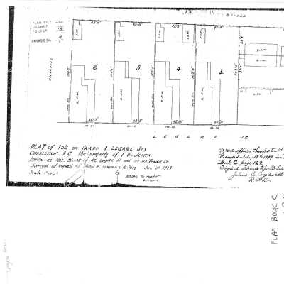 File contains photocopy of 1919 "Plat of Lots on Tradd and Legare Streets" encompassing the northeast corner of Legare and Tradd (36 Legare, 38 Legare, 40 Legare, 42 Legare, 112 Tradd, and 114 Tradd); photocopy of 1775? plat of 41 Legare (northwest corner of Legare and Tradd); 36 Legare FOHG tour script (1997); Philip Simmons ironwork survey sheet for 36 Legare Street.