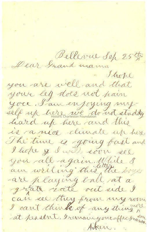Letter dated Sept. 25, [1884], from William Aiken Rhett to his grandmother [Harriet Lowndes Aiken] about his time at Bellevue [Plantation?].