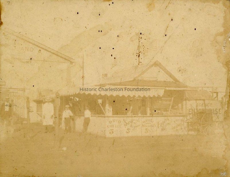 Late 19th century photograph of what appears to snack bar or restaurant, possibly in Sullivan's Island. Three men and two boys stand nearby. [Isl]and (?) painted on building in background.Collection