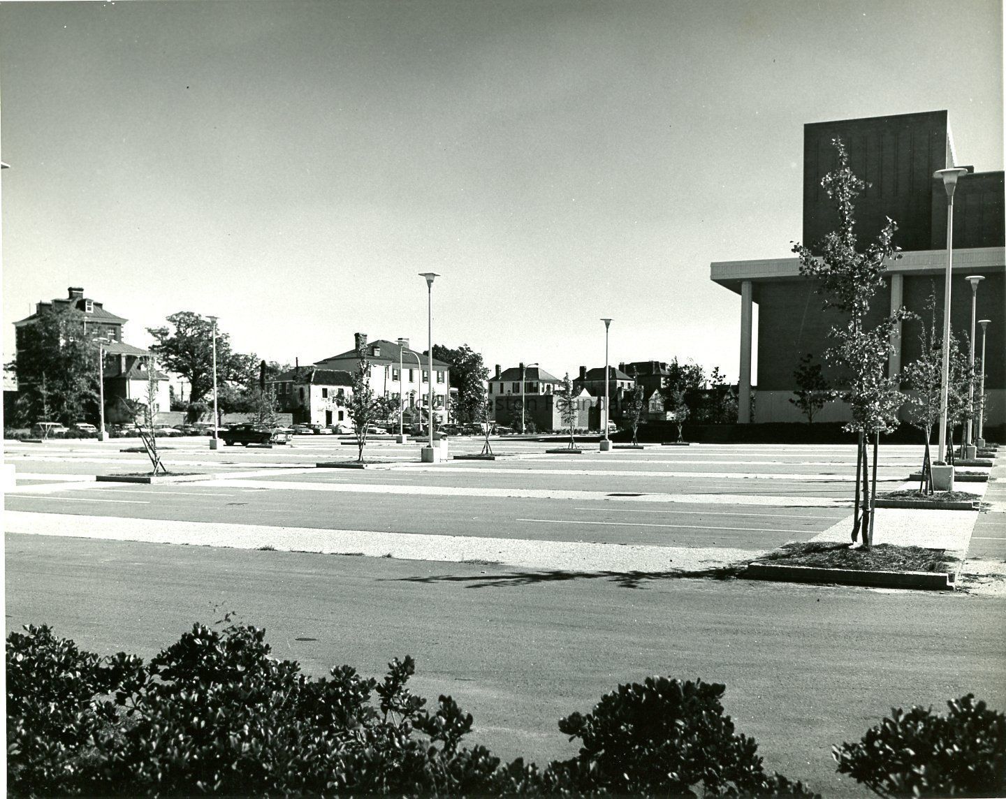 B&W photograph of the view looking east at the Charleston Municipal Auditorium (a/k/a Gaillard Auditorium). Several houses across the street are also in view.