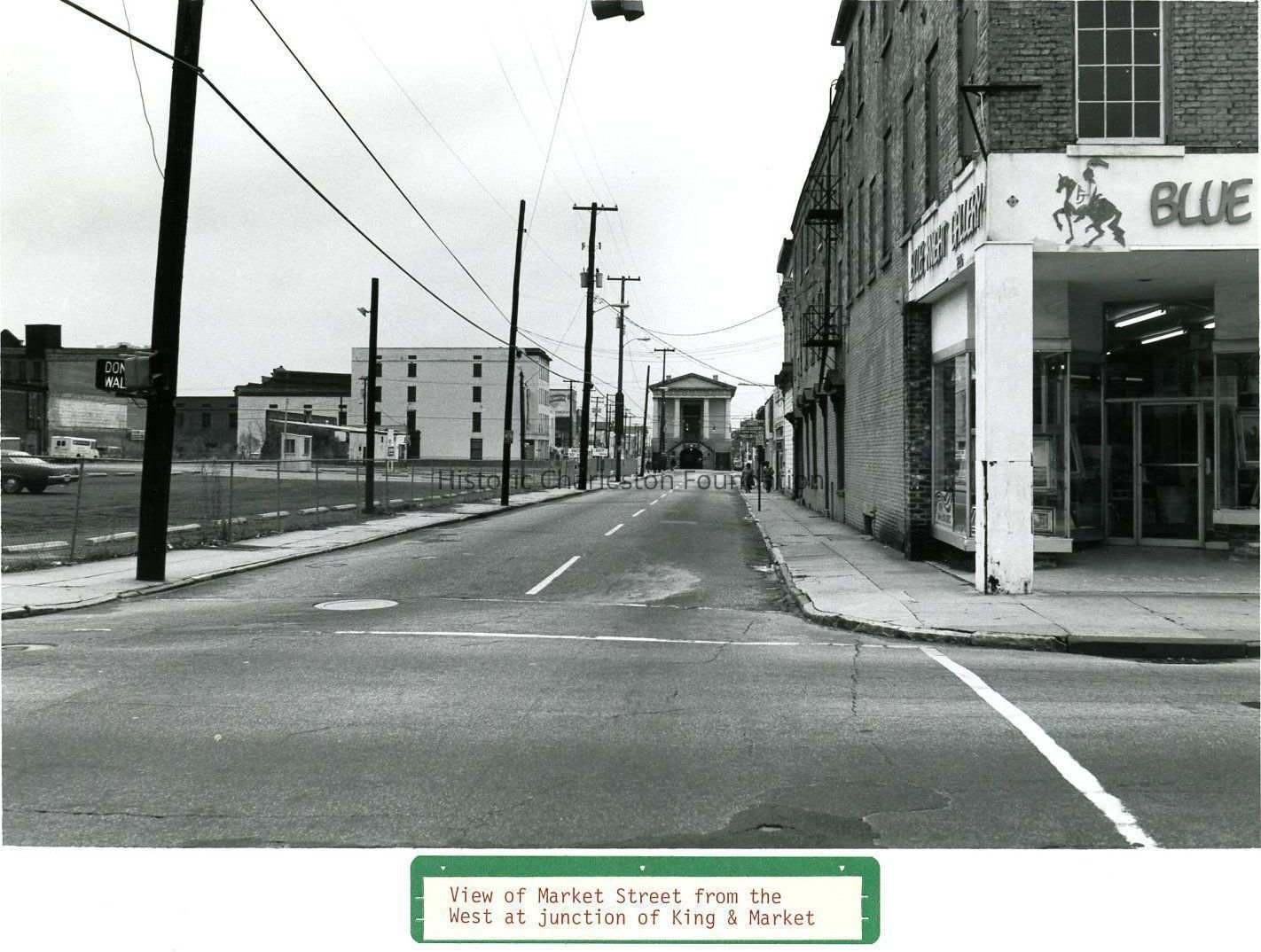 B&W photograph of the view looking east on Market Street from the junction of King Street and Market, from the vacant lot where Belk Department Store once was (left) and 220 King Street (Blue Knight Gallery) (right) down to Market Hall. Meeting Street elevation of the Arnold-Hornik Building (112 North Market) also in view. Vacant lot is now the site of Charleston Place / Charleston Center.