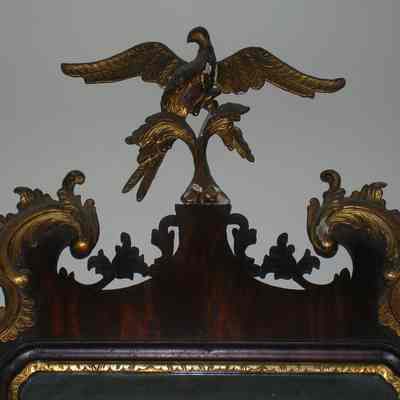 Chippendale Style Looking Glass with Scrolled, Pierced and Acanthus Carved Gilt Crest Centering a Gilt Phoenix Above a Molded Rectangular Mirror Frame. Flanked By Carved Pendant Foliage.Collection