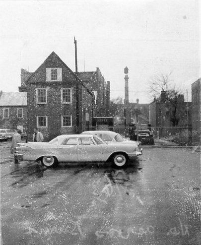 B&W photograph of the view looking north across Burns Lane. Calhoun Monument in Marion Square in background. Cars in parking lot. Photo dated 2/1963.Collection