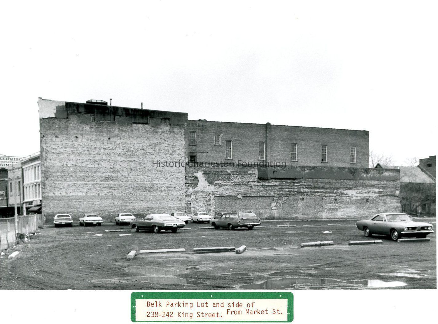 B&W photograph of the view looking north across what was a parking lot for Belk Department Store (232 King Street), now the site of Charleston Place (f/k/a Charleston Center). Shows the southeast elevation of 238-242 King Street. Portion of Kerrison's (department store) in background at far left.Context