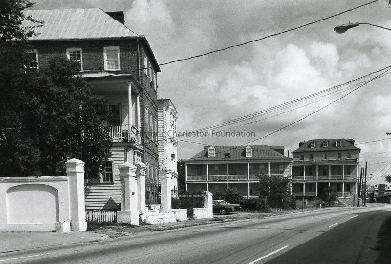 B&W photograph of the view looking north on East Bay Street from the Moses-Levy House (301 East Bay) to the Stephen Shrewsbury House (311 East Bay), and beyond. Also shows 303 East Bay and the south elevation of 39 Laurens.Collection