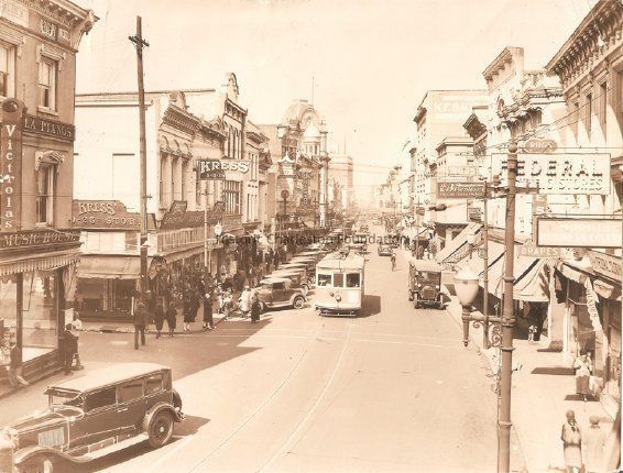Photograph (scan) featuring King Street looking north from just below Beaufain Street (mid-240 block). At left, buildings include those from Siegling Music House (243 King) and Kress Building (245-247 King) to the Francis Marion Hotel. At right, buildings include Federal Clothing Store (244 King), C.B. Prentiss Home Outfitters (250 King), and the Tip Top Inn. King Street is bustling with activity: cars, trolleys, and pedestrians.Collection