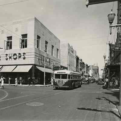 Two B&W photographs of the view looking north on King Street from the corner of Wentworth Street to the Francis Marion Hotel. Almost the same view but taken approximately twenty years apart. Buildings on the west side of the street are more prominent than the east side. In both photographs there is pedestrian activity and vehicles on the street.