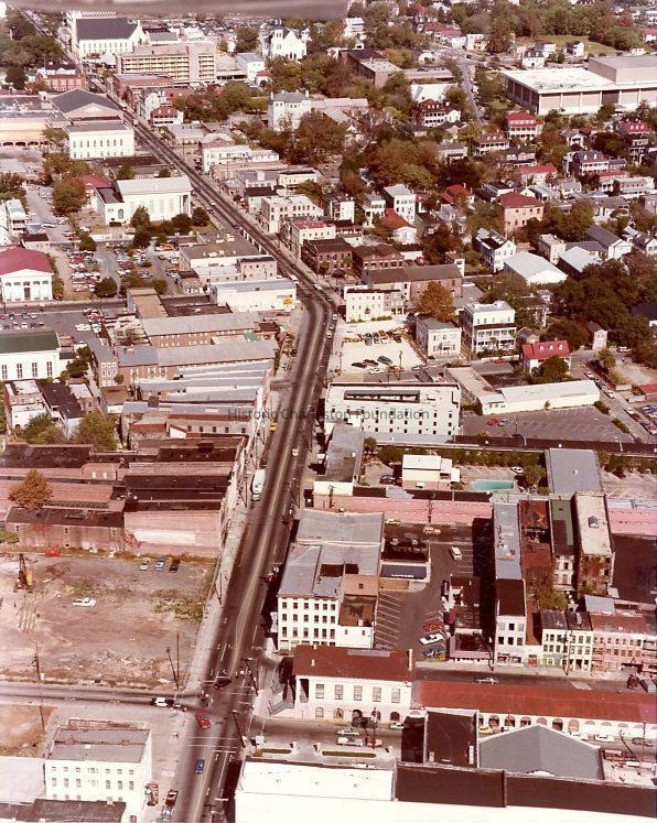 Color photograph featuring an aerial view looking north on Meeting Street from Market Street to the L. Mendel Rivers Federal Building. Taken before the construction of Charleston Place; see vacant lot at left foreground. Color photograph.Collection