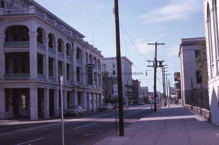Color photograph (Kodachrome II slide) of the view on Meeting Street looking north from the Timrod Hotel [100 Meeting Street]. Neon sign for the hotel projects from the building. St. John Hotel next door also in view. Esso [gas station] sign at 108 Meeting Street in background at right. Cars parked in front of hotel.Photograph Details