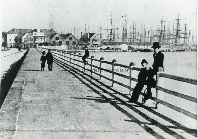 B&W reprint of a late-19th century photograph of the view looking north on The Battery. Three gentlemen are leaning or sitting on the barrier fence and two pedestrians are walking on the sidewalk. Ships are docked at the wharves and the Missroon House and neighboring structures (some gone now) are in the background.Collection