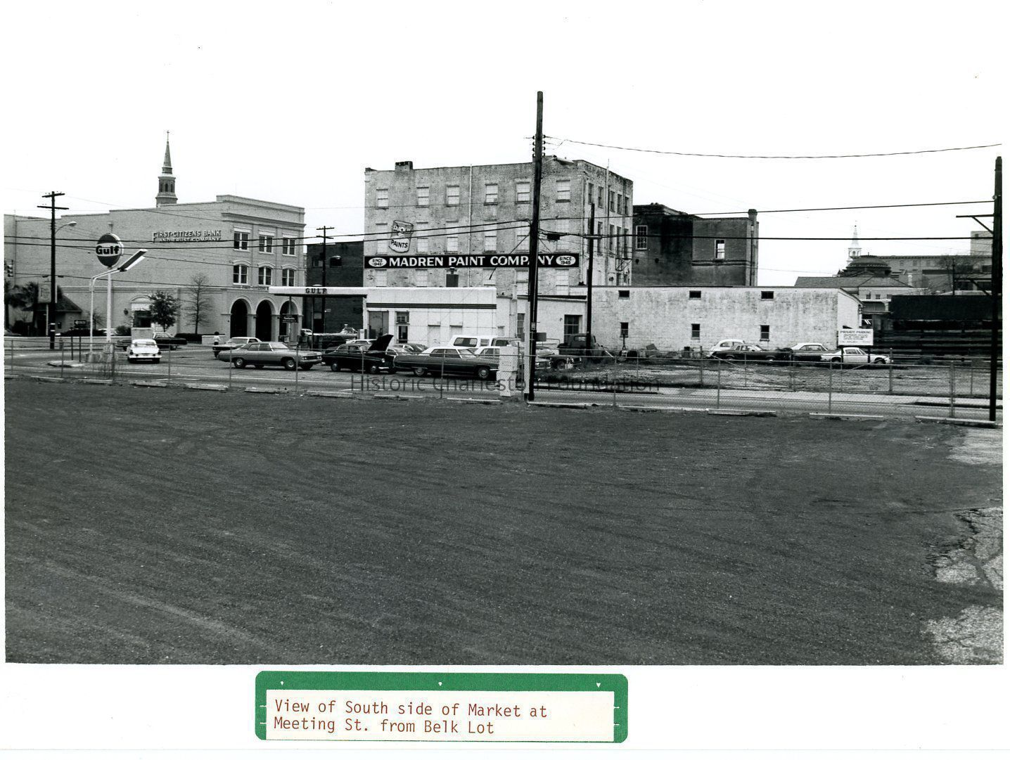 B&W photograph of the view south across what was a parking lot for Belk Department Store, now the site of Charleston Place (f/k/a Charleston Center), to the south side of Market Street, and showing the cornier of Meeting Street and Market, Parson's Gulf Station (181-183 Meeting), Madren Paint Company (177 Meeting), and First Citizens Bank (182 Meeting).Context