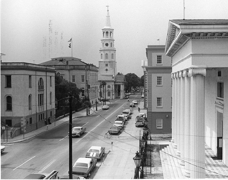 B&W photograph of the view south on Meeting Street from the Hibernian Hall (105 Meeting). Shows the Fireproof Building, City Hall, and St. Michael's Church on the east side of the street, and the Hibernian Society and County Offices Building on the west side of the street. Cars on street, both parked and driving.
