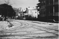 B&W photograph (scan) of the view looking north on St. Philip Street. House with fancy porch on the opposite corner. The house is located in the section of town where houses are being demolished to expand the off-ramp for King Street.Context
