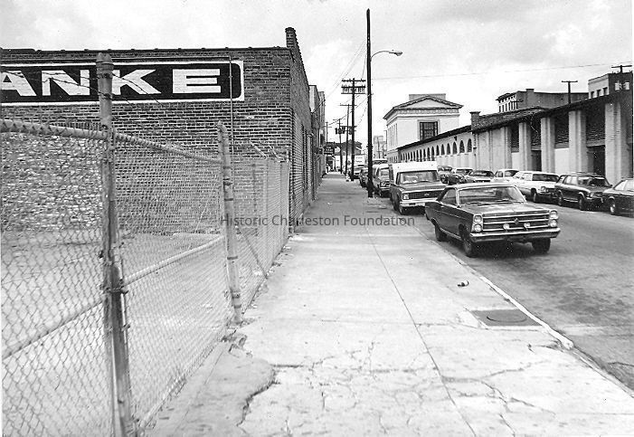 B&W photograph of the view looking west on Market Street showing the south elevation of the Market Street sheds and a corner of the C.D. Franke Building (Market Street elevation). Rear of Market Hall in backgeround.Collection