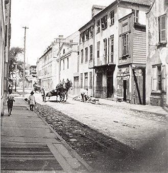 B&W photograph of Queen Street, looking west, showing 14 Queen Street through 28 Queen Street (right-to-left). Mule-drawn cart on street. Two African American children on sidewalk. Man bent over a small scrap pile on sidewalk.Collection