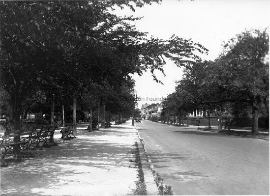 B&W photograph of South Battery, looking west near the intersection of South Battery and Meeting Street. Shows the park benches at White Point Gardens along the walkway that borders the street and a car in the distance. Largely obscured by trees is the George Robertson House (1 Meeting Street). Houses slightly further down South Battery are also in background.Collection