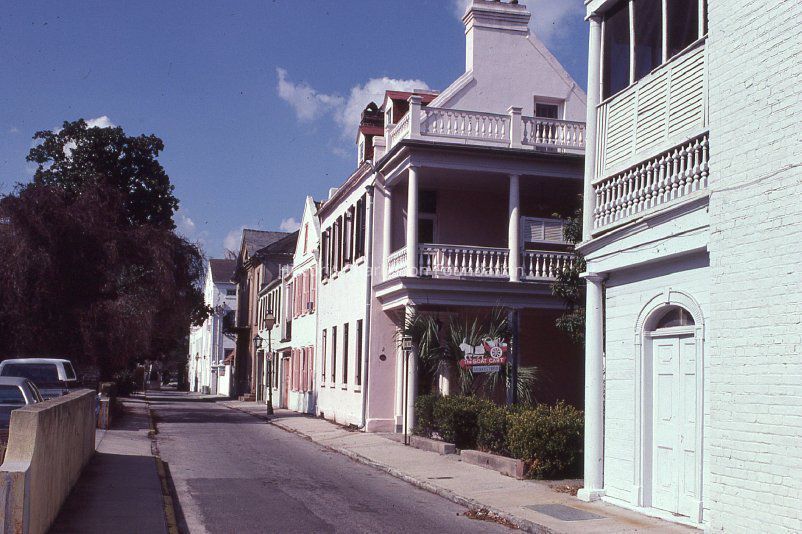 Kodachrome slide of the view looking west on St. Michael's Alley, beginning at 2 St. Michael's Alley when it was the Goat Cart Antiques/Trifles.Photograph Details